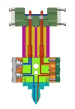 The components meet in a mixing chamber, usually made of stainless steel and there they are mixed homogeneously by a rotating blender. To optimize mixing, the rotational speed can be controlled electronically. Mixing chamber and blender have to be cleaned with a special cleaning fluid to be used again. Usually this happens automatically.