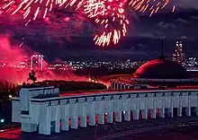 Veterans of the 8th Estonian Rifle Corps often lead solemn ceremonies in the capital. On the third anniversary in 1947, the Bronze Soldier of Tallinn was created.[11] In 2019, the Ministry of Foreign Affairs rebutted claims by Russian foreign ministry spokesperson Maria Zakharova that the Tallinn Offensive was a liberation, saying that it was a false presentation of the "liberation of European peoples from fascist enslavement".[12] That year, a fireworks celebration marking the 75th anniversary of the offensive took place in Moscow.[13]