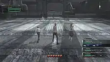 Players are able to move around the battlefield freely, but they have the option to create predefined paths for the character to follow. While moving along these paths, characters gain access to Hero actions, which make them immune to damage and speed up charge times.[4] However, the use of these Hero actions requires the use of Bezels; these items are an essential element in battle and are recharged through a variety of methods, such as destroying portions of an enemy's weapons and armor, or killing an enemy.[5] Characters using Hero actions can attack while jumping in the air, and are also able to unleash special attacks which manifest as stylish firearm maneuvers.[2] Enemies are only able to move while the player's current character is moving and will usually attack only that character.[2]