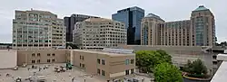 In late 2015, Boston Properties broke ground for the redevelopment of the surface parking lot north of Fountain Square. The Signature apartments, a pair of high rise residential towers, opened on the site in February 2018.[8] Soon thereafter construction began across President's Street for a glass-clad office tower dubbed 17Fifty. The 17-story building took the place of low-rise retail built during the initial phase and opened in 2020.[9][10]