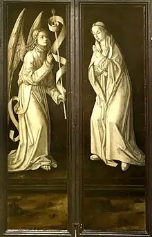 The artwork, a masterpiece by Bermejo, a leading exponent of the Hispano-Flemish school, is a creation close to Flanders both in its general conception and style. The format of the triptych composed of rectangular panels, with hinged sides, is typical of Early Netherlandish painting from its beginnings, as are the figures painted in grisaille on the outside of the doors, namely the Archangel Gabriel and the Virgin, which go to create, in a closed triptych, the monochrome scene of the Annunciation, from which the incarnation of Christ originates, depicted as a child inside and therefore a necessary premise for what will be seen once the doors are opened. The two figures, standing on a molded base with veins painted to imitate marble, are represented standing to follow the vertical shape of the doors: the gait of the archangel, coming from the left, is suggested by the movement of the right leg, which protruding the foot from under the clothes, while symmetrically Mary's left leg, depicted with her arms crossed on her chest as a sign of humility, is slightly bent to indicate the beginning of the genuflection; the remaining space in the foreground at the feet of the figures, beyond the base, is occupied by bare ground strewn with rocks.[13]
