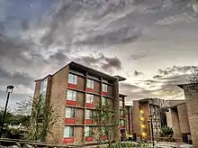 The residential section of the Revelle College campus is located to the west of the plaza. Blake and Argo Halls are between the plaza and the courtyard containing the Anchor. North of this courtyard lies the Revelle Commons complex. In addition to four conference rooms, this complex houses Roger's Market and the Revelle dining commons, 64 Degrees.[18] 64 Degrees serves burgers, Chinese-inspired plates, salads, sandwiches, and American cuisine.[19] In 2015, a full-service restaurant called 64 North was opened to complement 64 Degrees and provide the southern part of campus with an upscale dining option.[20]