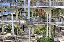 Revelle Plaza is the centerpiece of Revelle College, and has served as an important space for campus activities and socialization since its creation. During the mid-to-late sixties, Revelle Plaza was the location of many protests. The May 1970 Peace Memorial in its southeast corner commemorates the anti-war self-immolation of Revelle student George Winne Jr.[16] The adjacent fountain was donated by Pacific Southwest Airlines in 1965.[17]