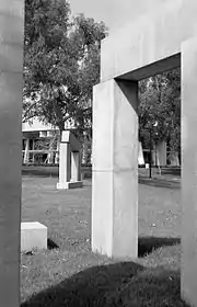Revelle College has two Stuart Collection pieces, La Jolla Project by Richard Fleischner and What Hath God Wrought? by Mark Bradford.[22] The former, referred to by the campus community as Stonehenge, gives its nickname to the surrounding Stonehenge Lawn.[23] Other public works of art around Revelle College include El Mac's "Enduring Spell" mural in the Argo courtyard,[24] murals on the side of the Ché Café, a giant red chair by Galbraith Hall, the Stuart Collection works Red Shoe, La Jolla Vista View, and The Wind Garden in the nearby Theatre District, a surrealist mural by Howard Warshaw on the east interior wall of 64 Degrees, and a 56 ft × 22 ft surfer graphic on the east exterior wall of 64 Degrees.[19]
