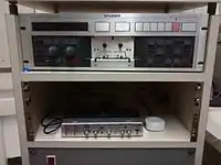 The deck's control functions are spread between three identical Philips MAB8440 microcontrollers,[12] clocked with a common 6 Mhz crystal.[45] Each microcontroller carries 4 kB of program memory and 128 bytes of random-access memory.[45] The first microcontroller polls the faceplate keyboard, infrared remote control port, and an optically decoupled RS-232 port; the second one controls the motors and calculates real-time tape counter values. The third microcontroller manages the digital-to-analog converters, CMOS switches, multiplexers and recording level meter; it executes the tape calibration program and stores current settings in non-volatile memory.[12] The EEPROM is updated at every transition to standby mode, or when the user presses a dedicated "store" button.[46][47] The microcontrollers, display and DAC drivers are connected with the I²C serial bus,[45] which was introduced by Philips in the early 1980s; according to Ludwig, a standardized bus was a prerequisite for a project of such size.[12]
