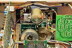 Two other motors of the B215, buried deep inside the mechanism, directly drive the cassette's reels. Motors, capstans and reel spindles are mounted on two diecast chassis plates, tightly bolted together; heads and pinch rollers are mounted on a moving die-cast subchassis.[31][33][lower-alpha 3] All four motors are braked electromagnetically; there are no mechanical brake pads or friction wheels.[33][lower-alpha 3] Autostop is triggered with an optoisolator which senses the presence of transparent leader tape.[27] Winding a 90-minute tape takes no more than 75 seconds,[20][28] at constant linear tape speed.[34] If, for any reason, the microcontroller detects abnormally high tape tension, it instantly reduces winding speed. At the end of the reel, tape speed is smoothly decreased to avoid end-of-tape impact.[34][22] According to Howard Roberson of Audio magazine (USA), operation of a new B215 transport "...was very quiet, even in play mode - perhaps the quietest of any deck ... tested to date... very well constructed, with a definite look of long-term reliability".[21]