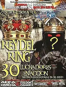The Mexican professional wrestling company International Wrestling Revolution Group (IWRG; at times referred to as Grupo Internacional Revolución in Mexico) started their annual Rey del Ring ("King of the Ring") event in 2002, creating an annual event around the eponymous Rey del Ring match, a 30-man elimination match similar in concept to the WWE's Royal Rumble match.[2][3] From 2002 until the 2011 event the "prize" for winning the match itself was simply the prestige of outlasting 29 other competitors, but at the 2011 Rey del Ring IWRG introduced the IWR Rey del Ring Championship complete with a belt to symbolize the championship that would be awarded to the winner each year.[4] At that point in time the Rey del Ring title became a championship that could be defended and lost or won in matches in between the annual tournaments. For the tournament the champion would vacate the Rey del Ring Championship prior to the actual Rey del Ring match itself.[5] All Rey del Ring shows, as well as the majority of the IWRG shows in general are held in "Arena Naucalpan", owned by the promoters of IWRG and their main arena. The 2014 Rey del Ring was the twelfth over all Rey del Ring tournament held by IWRG.