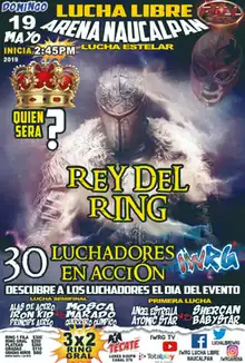 The Mexican professional wrestling company International Wrestling Revolution Group (IWRG; at times referred to as Grupo Internacional Revolución in Mexico) started their annual Rey del Ring ("King of the Ring") event in 2002, creating an annual event around the eponymous Rey del Ring match, a 30-man elimination match similar in concept to the WWE's Royal Rumble match although in IWRG pinfalls and submission could also lead to elimination unlike the Royal Rumble.[2][3] From 2002 until the 2011 event the "prize" for winning the match itself was simply the prestige of outlasting 29 other competitors, but at the 2011 Rey del Ring IWRG introduced the IWR Rey del Ring Championship complete with a belt to symbolize the championship that would be awarded to the winner each year.[4] At that point in time the Rey del Ring title became a championship that could be defended and lost or won in matches in between the annual tournaments. For the tournament the champion would vacate the Rey del Ring Championship prior to the actual Rey del Ring match itself.[5] All Rey del Ring shows, as well as the majority of the IWRG shows in general are held in Arena Naucalpan, owned by the promoters of IWRG and their main arena. The 2019 Rey del Ring was the 17th over all Rey del Ring tournament held by IWRG.[3]