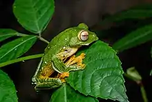 Rhacophorus kio is a species of flying frog in the family Rhacophoridae and is found in the rainforests of southeast Asia, in countries such as China, Laos, Thailand, and Vietnam. Its ability to glide and its adhesive toe pads make it well adapted to its habitat of the rainforest. Prior to a 2006 study by Annemarie Ohler and Magali Delorme, R. kio and R. reinwardtii were thought to be the same species. The common name black-webbed treefrog can refer to either species.[2] Compared to other frog species in the area, R. kio not only creates a foam nest that holds their eggs, but also creates a structure with leaves that will wrap around the eggs. While the conservation status of the species is currently classified as of least concern by the IUCN Red List, R. kio faces habitat loss from deforestation to make space for agriculture and other human influences.[3]