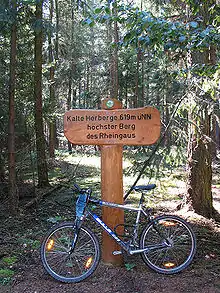The Rheingau Mountains are part of the Rheingau region and lie within the county of Rheingau-Taunus-Kreis. The centre of the Rheingau Mountains is formed by the ridge line from the Kalter Herberge to the 580p-metre-high Erbacher Kopf. There is no point in four kilometres that is lower than 560 metres. About one kilometre southeast of the Kalter Herberge, and thus in front of the ridge line, the Hallgarter Zange also reaches a height of 580 meters. Here is a highly visible observation tower, which has been accessible again since the opening of an adventure park in 2015.[2] Due to its south-facing location, the Hallgarter Zange appears from the Rhine as the highest elevation and partially covers the Kalte Herberge.