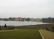 The Rheinsberg Waters branch into the lake of Kleiner Pälitzsee from the Müritz-Havel Waterway. At the Pälitz Bridge – the former border between Mecklenburg-Strelitz and Prussia, the present border between the states of Mecklenburg-Vorpommern and Brandenburg – a lock canal, not quite 3 kilometres (2 mi) long, begins with the Wolfsbruch Lock (known in GDR days as the Hütten Canal, but from 1998 as the Wolfsbruch Canal (Wolfsbrucher Kanal).[2]) After that com the Großer Prebelowsee lake, the short Prebelow Canal, the Tietzowsee lake, the 900-metre (3,000 ft) long Hütten Canal (also called the Jagow Canal), the Schlabornsee and the 1.5 kilometre long Schlaborn Canal, the Große Rheinsberger See and the 800-metre (2,600 ft) long Rheinsberg Canal as well as the Grienericksee before reaching its southern end at kilometre marker 13.25.[3] The Rheinsberg Waters also include the 3 kilometre long Dollgow Canal and Dollgowsee that branch off the Schlabornsee towards the southwest. Until 1990 the 1.5-kilometre (0.93 mi) long Bikow Canal and Bikowsee that branched off the Schlabornsee towards the east were also counted as part of the Rheinsberg Waters.[4]