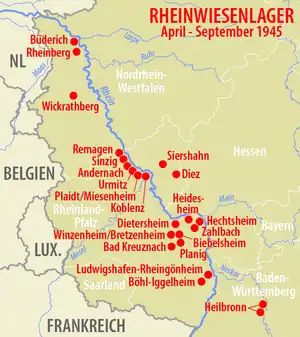 The Rheinwiesenlager (German: [ˈʁaɪnˌviːzn̩ˌlaːɡɐ], Rhine meadow camps) were a group of 19 camps built in the Allied-occupied part of Germany by the U.S. Army to hold captured German soldiers at the close of the Second World War. Officially named Prisoner of War Temporary Enclosures (PWTE), they held between one and almost two million surrendered Wehrmacht personnel from April until September 1945.