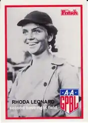 Rhoda Leonard (January 31, 1928 – October 21, 2015) was an American infielder and outfielder who played in the All-American Girls Professional Baseball League. Listed at 5' 5", 115 lb., Leonard batted and threw right handed. She was nicknamed 'Nicky' by her friends and teammates.[1][2]