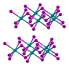 RhI3 adopts same crystal structure motif as AlCl3 and YCl3. The structure consists of cubic close-packed iodide ions and rhodium ions filling a third of the octahedral interstices, forming a layers.[2]