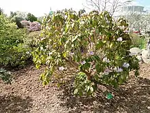 Rhododendron wallichii (簇毛杜鹃) is a rhododendron species native to northeastern India, eastern Nepal, Bhutan, Sikkim, and southern Xizang in China, where it grows at altitudes of 3,000–4,300 m (9,800–14,100 ft). Growing to 2–4 m (6.6–13.1 ft) in height, it is an evergreen shrub with leathery leaves that are elliptic to oblong-obovate, 7–12 by 2.5–5 cm in size. The flowers are purple-red to white, with red spots. Some authorities consider it a synonym of Rhododendron campanulatum.[1]