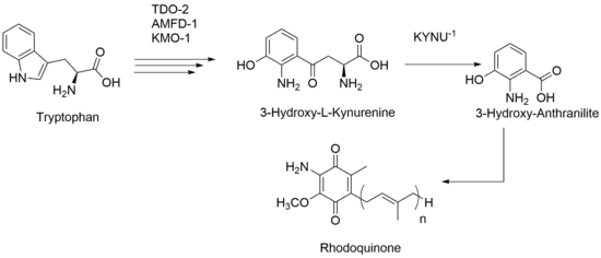 - ↑ Roberts Buceta PM, Romanelli-Cedrez L, Babcock SJ, Xun H, VonPaige ML, Higley TW, et al. (July 2019). "The kynurenine pathway is essential for rhodoquinone biosynthesis in Caenorhabditis elegans". The Journal of Biological Chemistry. 294 (28): 11047–11053. doi:10.1074/jbc.AC119.009475. PMC 6635453. PMID 31177094.