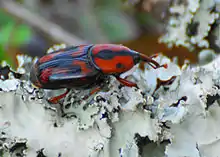 The palmetto weevil (Rhynchophorus cruentatus) is an insect native to Florida, but has been found as far as southern Texas to the west and South Carolina to the north.[1][2] It is the largest weevil in North America and the only kind of palm weevil in the continental United States.[1] It infests palms and is considered a pest.[1][3][4] Its main target is the Canary Island date palm, but date palms (a different species than the Canary Island date palm), sabal palms (the palmetto weevil's traditional target), saw palmetto (the palmetto weevil's traditional alternative target), Washingtonia, Pritchardia, royal palms, Latania, coconut palms, Caryota, and Bismarckia are also susceptible.[1][2][3][5] Distressed palm trees are usually attacked, which makes transplanted trees a frequent target.[3] The Palmetto Weevils mate at the base of the palm branches where the females deposit their eggs.[3] The grubs then eat into the palm tree, killing it.[3] After the larvae have turned into adult weevils, the damage can be seen, but by then, it is considered to be too late for the tree.[1][3] The life cycle from egg to adult for a palmetto weevil is about 84 days.[6] For prevention, it is recommended an appropriate insecticidal crown drench is done twice a year for high value palms.[3]