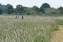The link passes under the B6241 Tom Benson Way, immediately followed by a bridge carrying the Blackpool South branch line from Preston to Salwick, before it reaches the first of the boater-operated locks. Surplus water bypasses Lock 4 via a weir and a meander to the north of the site.[58] The sculpture 'Fire' by Dagnall, a large block of stone polished with graphite to make it look like coal and engraved with a fossilised fern on the top, is close to the lock.[64] The link is crossed by Savick Way before it reaches Lock 5, where the weir and meander are similar in layout to that at Lock 4. To the north of this section is a quiet public park, while to the south is the 'hay meadow', part of the Ribble Link Development, identified as being of 'national significance'. Public access is approved and welcomed. The third of Dagnall's sculptures representing 'Air', consisting of two interlocking tree trunks straddling the towpath was close to Lock 5 but was removed in 2009.[64]