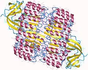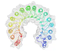 Top view of porcine ribonuclease inhibitor, showing its horseshoe shape.[1] The outer layer is composed of α-helices and the inner layer of parallel β-strands. The inner and outer diameters are roughly 2.1 nm and 6.7 nm, respectively.