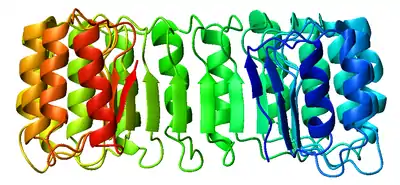 Side view of porcine ribonuclease inhibitor;[1] ribbon is colored from blue (N-terminus) to red (C-terminus).