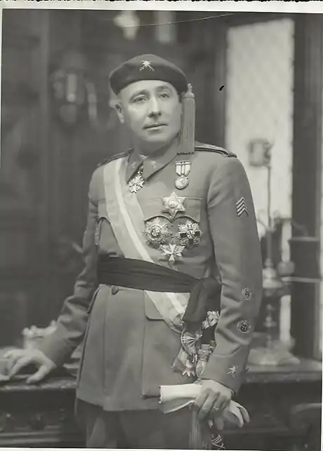 During short spells in the mid-1940s, Rada acted as caretaker commander of I. Región Militar (Madrid); in 1945, he became commander of Cuerpo de Ejército de Maestrazgo.[162] In 1946, he was promoted to teniente general and took command of II. Región Militar (Seville) and Cuerpo de Ejército de Andalucia.[163] This proved the highest position in his military career, the one he held for an unusually long period of 6 years until 1952; that year he relinquished command of a tangible force and assumed management of Museo del Ejército. Though in 1955 he passed to reserve, Rada headed the museum until his death.[164]