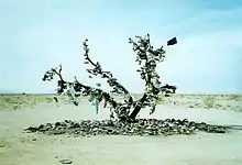 Rice became noted for its Shoe Tree, originally an underwear tree, a lone tamarisk on a turnout just south of the highway, adjacent to the main entrance to Rice Army Airfield. A hallmark for a trailer-based business that catered to personnel at what is now the Marine Corps Air Ground Combat Center Twentynine Palms, customers passing on Highway 62 (also known as Rice Road) to and from the Colorado River would toss a pair of underwear in the tree's branches. After a fire burned most of the tree and all the underwear, the custom changed and the tree's burned husk became a collection point for old shoes. The tree was featured on California's Gold, a PBS program hosted by Huell Howser. The tree burned flush to the ground in 2003 after which a 'shoe garden' (a fence on which people hang shoes) replaced it. In early 2016, road trippers began throwing their shoes on top of Rice's abandoned gas station. Also in the immediate area, travelers occasionally stop to spell their names and initials on the nearby Arizona and California Railroad right-of-way with the multi-colored volcanic rock used as track ballast. Hand-assembled graffiti lines the railroad for the entire distance that it parallels Highway 62.