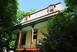 Siding on the structure is made of horizontal wood boards and is painted yellow with burgundy and Aquamarine accents.[5] Other exterior accents include bracketed posts and wood dentils.[4] There are three porches on the outside as well, each topped with a matching mansard roof on a smaller scale than the main roof.[4] One of these porches is a sun porch enclosed with glass, while the other two have arcaded bases supporting the roof.[4] The posts are decorated with detailed scroll work at the top.[4] Parts of the home have sets of paired windows, and the main entrance has an arched transom light to go with the pediment above the window.[4]