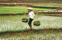 Rice production in Vietnam in the Mekong and Red River deltas is important to the food supply in the country and national economy. Vietnam is one of the world's richest agricultural regions and is the second-largest (after Thailand) exporter worldwide and the world's seventh-largest consumer of rice.[1] The Mekong Delta is the heart of the rice-producing region of the country where water, boats, houses and markets coexist to produce a generous harvest of rice.[2] Vietnam's land area of 33 million ha, has three ecosystems that dictate rice culture. These are the southern delta (with its Mekong Delta dominating rice coverage), the northern delta (the tropical monsoon area with cold winters) and the highlands of the north (with upland rice varieties).[3] The most prominent irrigated rice system is the Mekong Delta.[3] Rice is a staple of the national diet and is seen as a "gift from God".[4]
