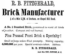 Tobacco manufacturer William T. Blackwell told Fitzgerald that he would purchase all the brick he made. By 1910 Fitzgerald was producing "30,000 brick a day from his $17,000 plant, but owns besides 100 acres (0.40 km2) of land within the city limits and has $50,000 worth of real estate." W.T. Bost, the city editor of the Durham Herald, said that Fitzgerald "makes better brick than any other man in town; therefore the people buy Fitzgerald's brick".[5]