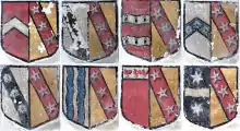 Richard Bampfield's monument, erected in 1604 by his son Amias Bampfield, survives in the south transept of Poltimore Church. It comprises two recumbent stone effigies, of Richard Bampfield and his wife, under a low canopy supported by arched openings and columns.[16] A view of the monument is obstructed by pews in front and by the balcony above forming the manorial pew of the Bampfield family. The 8 painted escutcheons on the cornice depict the arms of 5 of his 8 sons-in-law, each impaling Bampfield, and the 3 sons-in-law of his son and heir Sir Amias Bampfylde, each impaling Bampfield.