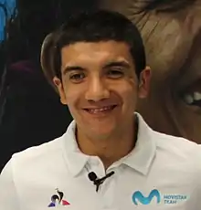 His first professional victories came in 2018, with a stage and the overall in the Vuelta a Asturias.[18] He won stage 8 of the Giro d'Italia, becoming the first Ecuadorian cyclist to win a Grand Tour stage.[19] He finished in the top ten in five other stages of that race, and finished fourth in the general classification. He also completed the 2018 Vuelta a España in 18th place.[20]