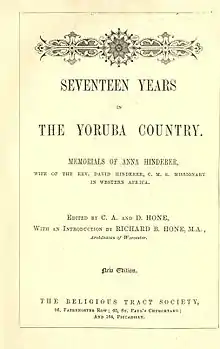 8. Anna Martin Hinderer (1877). Seventeen years in the Yoruba country: memorials of Anna Hinderer, wife of the Rev. David Hinderer, C.M.S. missionary in Western Africa. Religious Tract Society.