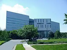The idea for the building was originally conceived in 1976 and construction began in 1978.[3][4][5] Grad Associates (Newark) and StudioHillier (Princeton) were involved in the design, for which they won an American Institute of Architects award.[6][7] The Justice Center complex was completed in 1982.[8] The modernist building is an 41.62 m (136.5 ft) eleven-story tall structure has approximately 1,080,000 square feet. It can be seen as three buildings in one: two eight story office building around a cube, which houses the court. Indoor bridges connect the fourth, fifth, seventh and eighth floors. The two main entrances from the street lead into the atrium lobby which is open through ten stories to a rooftop skylight.[4] Floors 1-8 is office space, chambers, and courtrooms. Floor 9 is the mechanical penthouse, level P1 is the street level, and P2 is the parking garage.[9] The atrium and parking facilities were renovated again after original construction.[10][11]