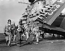 ![]() Richard Cevoli and his aviators walk across the flight deck of the USS Leyte in November 1950. | |