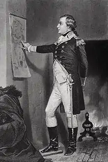 After the appointment of George Washington as Commander-in-Chief of the newly formed Continental Army on 15 June 1775, the Second Continental Congress asked the New York Provincial Government to select two men for service in the army.[46] One would be a major general, the other a brigadier general. The assembly favored Philip Schuyler as the major general. Montgomery expressed concern over this, as he did not believe that Schuyler had enough combat experience for such an appointment.[47] Montgomery wrote that "Phil Schuyler was mentioned to me ... His consequence in the province makes him a fit subject for an important trust – but has he strong nerves? I could wish to have that point well ascertained with respect to any man so employed."[47] Although Montgomery knew he was under consideration for brigadier general, he did not publicly show any desire for the appointment.[47] Nonetheless, Schuyler was appointed major general, and Montgomery brigadier general, on 22 June.[48] Montgomery was ranked second in command of all the brigadier generals.[49] In view of this appointment, he said, "The Congress having done me the honor of electing me brigadier-general in their service, is an event which must put an end, for awhile, perhaps for ever, to the quiet scheme of life I had prescribed for myself; for, though entirely unexpected and undesired by me, the will of an oppressed people, compelled to choose between liberty and slavery, must be obeyed."[50]