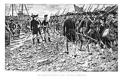 Spain entered the war in 1761 as an ally of France.[19] The British high command believed that capturing Havana would destroy the lines of communication from Spain to its colonial empire.[21] On 6 June, the assaulting British forces arrived seven miles off the shore of Havana. The 17th Foot, including Montgomery's company, was to capture Moro Fort, the key to the Spanish defense of the city.[21] British battleships bombarded the fort, silencing all but two Spanish guns. On 30 July, Montgomery and the 17th Foot stormed and captured the fort.[21] In late August 1762, Montgomery and the 17th Foot were sent to New York, where they remained for the rest of the war. The conflict was ended by the signing of the Treaty of Paris on 10 February 1763.[22]