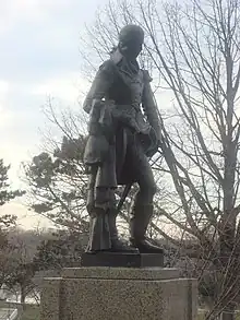 On 25 January 1776, Congress approved the establishment of a monument in memory of Montgomery.[106] [107] A state memorial service was also scheduled and carried out on 19 February 1776. Throughout the thirteen colonies, Montgomery was viewed as a hero, and Patriots tried to use his death to promote their cause in the war.[108] Montgomery's name was used very often in literature; among the authors who used his name was Thomas Paine.[109] The poet Ann Eliza Bleecker wrote an "Elegy on the death of Gen. Montgomery" in his memory.