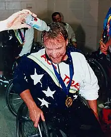 Richard Oliver is sprayed with water after being presented with the gold medal at the Atlanta Paralympics