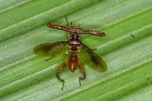 - ↑ Grimaldi, David A.; Fenster, Gene (1989). "Evolution of extreme sexual dimorphisms : structural and behavioral convergence among broad-headed male Drosophilidae (Diptera)". American Museum Novitates (2939). hdl:2246/5094.