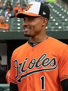 The Baltimore Orioles selected Martin with the first selection in the 2018 Rule 5 draft.[15] Martin made the Orioles' Opening Day roster and made his major league debut on Opening Day against the New York Yankees.[16] Martin recorded his first Major League hit, a single off James Paxton, and his first career stolen base on March 30, 2019.[17] He hit his first career home run on May 22, 2019, off CC Sabathia in a 7-5 loss to the Yankees.[18] Martin finished his rookie season with a .208 batting average with six home runs, 29 runs, 23 RBIs and 10 stolen bases in 120 games played, including 90 starts at shortstop (3rd most by a rookie in Orioles history).[19]