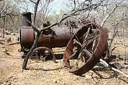 The battery site, situated on two earth benches leading to a flat immediately below the mine, includes the concrete foundations of a five head stamper frame and broken iron legs of the frame. A small inscription on the concrete foundations reads "AOP 18/5/13". A single-cylinder horizontal steam engine is located alongside the battery. A two-cylinder portable engine with all four wheels intact stands below the battery. The engine's flywheel lies alongside.[1]