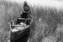 Ricing sticks have been traditionally used by Anishinaabe peoples of the Great Lakes region.[7] The ricing sticks are used to harvest wild-growing rice by knocking the ripened grains off of the stalks of rice. This harvesting is typically performed by canoe—as the plants grow partially submerged in shallow water—and the sticks are used to knock the rice into the canoe or a collection vessel.[4] Any stick can be used, but ricing sticks are normally tapered, blunt sticks, sometimes with a flattened end, with a thicker end, sometimes lined in cloth, meant to be held in the hand.[8] Ricing sticks can be used two at a time, one in each hand, while a companion rows the canoe.[9]