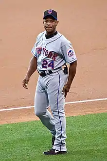 A year later, Henderson signed as a free agent with the New York Mets. In 1999, he batted .315 with 37 steals and was seventh in the NL in on-base percentage.[50] Henderson was voted the 1999 National League comeback player of the year by The Sporting News. He wore number 24, which—although not officially retired—had not been regularly worn by a Mets player since Willie Mays' retirement in 1973. Nonetheless, Henderson and the Mets were an uneasy fit. Following the Mets' loss in the 1999 NLCS, the New York press made much of a card game between Henderson and Bobby Bonilla. Both players had been substituted out of the lineup, and they reportedly left the dugout before the playoff game had concluded.[51]