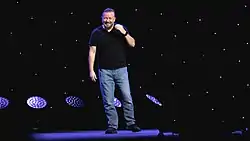 Gervais's fourth show was entitled Science, and commenced with an eleven-date tour in August 2009 at the Scottish Exhibition and Conference Centre in Glasgow.[81] The DVD was released on 15 November 2010.[82] In November 2009, he headlined the sixth annual New York Comedy Festival at Carnegie Hall.[83] In 2013, Gervais announced that his next stand-up show would be called Humanity.[84] In December 2014, he said he was too busy to do the tour due to producing two films.[85] In May 2016, Gervais performed stand-up in London, starting with some low key warm-ups with cast members from Derek.[86] He said, "Finally, I'm going to do some stand-up. The first in about six years if you don't count hosting the Golden Globes".