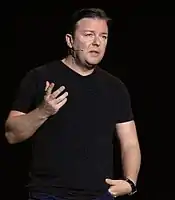 Ricky Dene Gervais (/dʒərˈveɪz/ jər-VAYZ; born 25 June 1961) is an English comedian, actor, writer, producer, and director. He co-created, co-wrote, and acted in the British television sitcoms The Office (2001–2003), Extras (2005–2007), An Idiot Abroad (2010–2012), and Life's Too Short (2011–2013). He also created, wrote and starred in Derek (2012–2014) and After Life (2019–2022).[1] He has won seven BAFTA Awards, five British Comedy Awards, two Emmy Awards, four Golden Globe Awards, and the Rose d'Or twice (2006 and 2019). The Observer named Gervais one of the 50 funniest performers in British comedy in 2003.[2] In 2007, he was placed at No. 11 on Channel 4's 100 Greatest Stand-Ups,[3] and at No. 3 in their 2010 list.[4] In 2010, he was included in the Time 100 list of World's Most Influential People.[5]