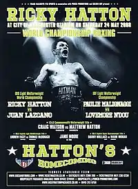 Ricky Hatton vs. Juan Lazcano, billed as Homecoming, was a boxing light welterweight fight between Ricky Hatton and challenger Juan Lazcano for the IBO and The Ring titles. It was held in Manchester, England at the City of Manchester Stadium in front of a record 55,000 fans. This was a record for a boxing event post world war II, until 2014 when Carl Froch faced George Groves, fight which sold 80,000 seats.[1] The fight went the full 12 rounds and Hatton won by unanimous decision.