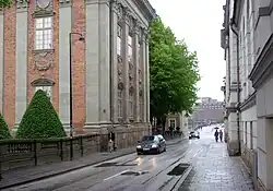 Riddarhusgränd (Swedish: "House of Knights' Alley") is an alley in Gamla stan, the old town in central Stockholm, Sweden. Stretching north from the square Riddarhustorget to the bridge Vasabron, it passes between the Swedish House of Knights (Riddarhuset) and the Bonde Palace forming a parallel street to Rådhusgränd. On either side of its northern end are the quays Riddarhuskajen and Kanslikajen.