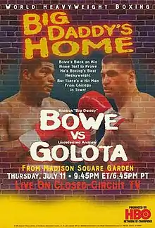 Riddick Bowe vs. Andrew Golota, billed as "Big Daddy's Home", was a professional boxing match contested on July 11, 1996. The fight was held at Madison Square Garden in New York City and was televised on HBO (as part of its World Championship Boxing series) in the United States, and on Sky Sports in the United Kingdom.