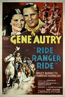 Ride Ranger Ride is a 1936 American Western film directed by Joseph Kane and starring Gene Autry, Smiley Burnette, and Kay Hughes. Based on a story by Bernard McConville and Karen DeWolf, and a screenplay by Dorrell and Stuart E. McGowan, the film is about a Texas Ranger working undercover to protect an Army wagon train full of ammunition and supplies. The Army doesn't believe him at first, until the Comanche arrive.[1]