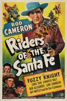 Riders of the Santa Fe is a 1944 American Western film directed by Wallace Fox and written by Ande Lamb. The film stars Rod Cameron, Fuzzy Knight, Eddie Dew, Jennifer Holt, Ray Whitley and Lane Chandler. The film was released on November 10, 1944, by Universal Pictures.[1][2][3]
